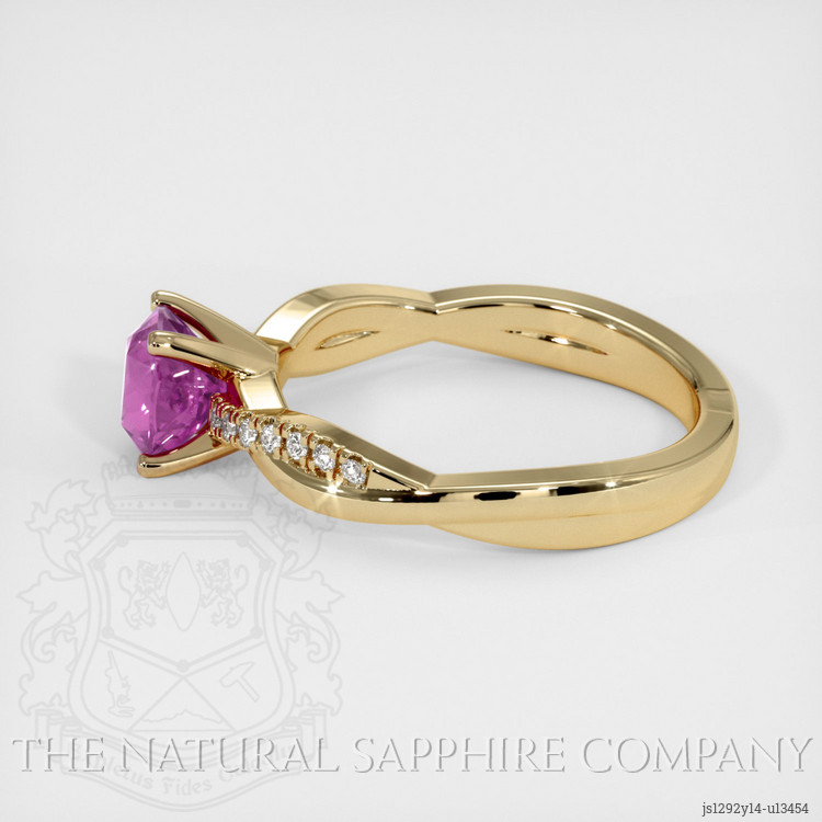 The ring features a beautiful, transparent 1.06 carat cushion shape purple sapphire with the dimensions of 6.09 x 5.05 x 4.34 mm and a mixed brilliant cut. It has a clarity grade of very slightly included (evaluated at eye level), vivid color saturation, and an excellent polish. The origin of this sapphire is Ceylon (Sri Lanka).