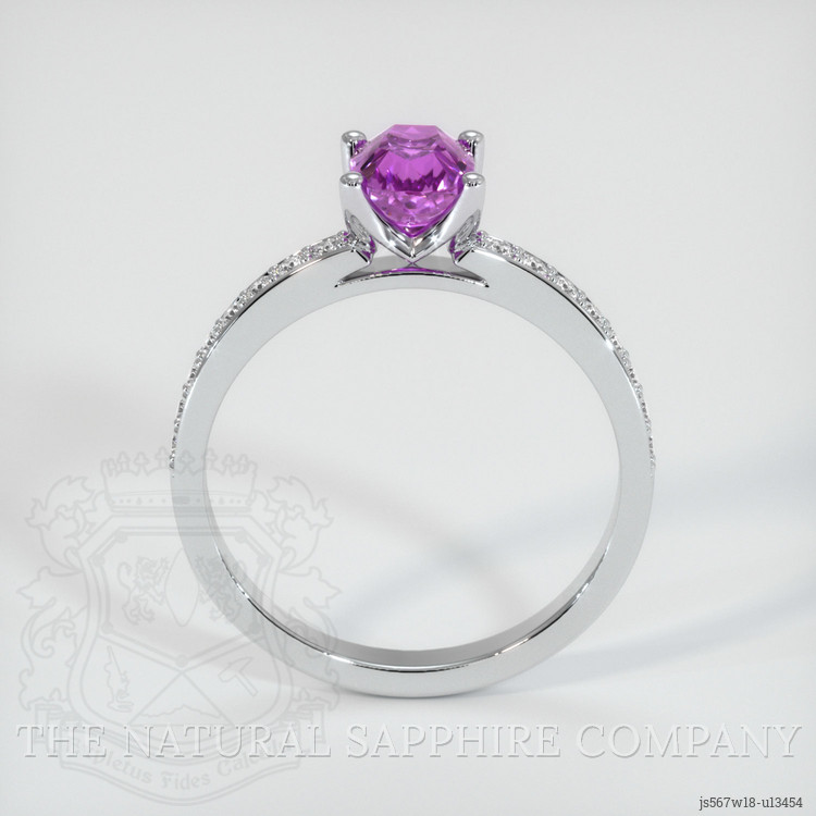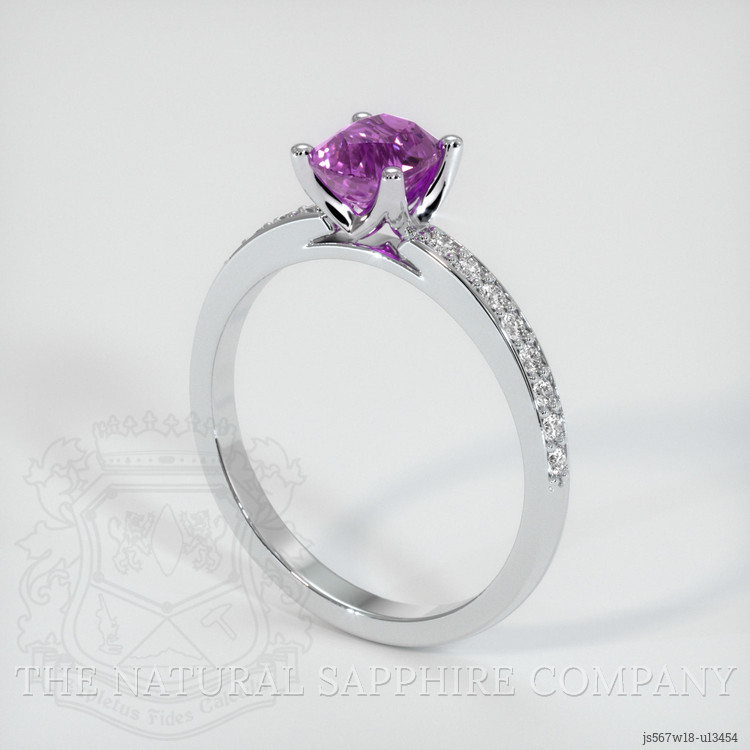 The ring features a beautiful, transparent 1.06 carat cushion shape purple sapphire with the dimensions of 6.09 x 5.05 x 4.34 mm and a mixed brilliant cut. It has a clarity grade of very slightly included (evaluated at eye level), vivid color saturation, and an excellent polish. The origin of this sapphire is Ceylon (Sri Lanka).