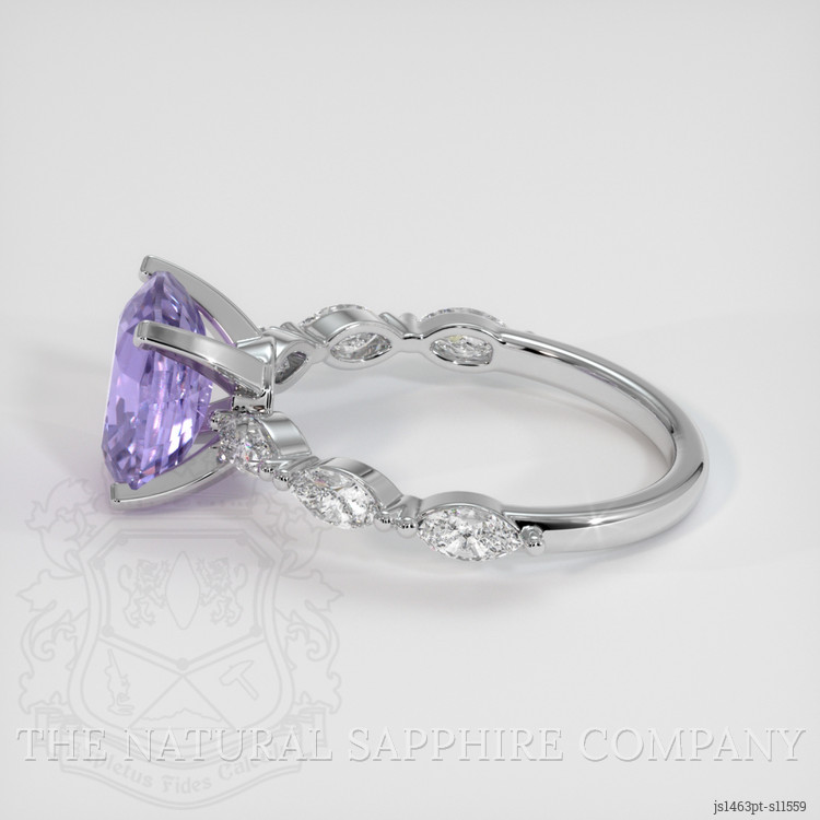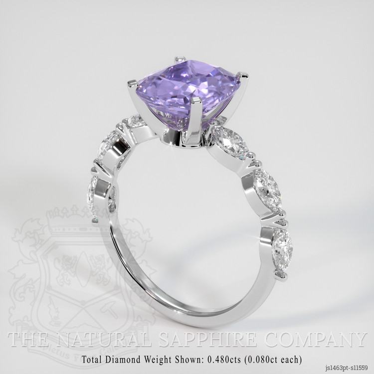 Introducing an exquisite creation from The Natural Sapphire Company, this ring showcases a magnificent 2.18 carat cushion-shaped purple sapphire as its centerpiece. Originating from the illustrious mines of Ceylon, Sri Lanka, this transparent gemstone is a testament to natural beauty and quality. Its dimensions of 8.03 x 7.33 x 3.69 mm and mixed brilliant cut enhance its allure, providing a balanced combination of depth and sparkle. With a clarity graded as very slightly included upon eye-level evaluation, the sapphire maintains its pristine appearance, while the medium color saturation brings out its vibrant purple hue. An exceptional polish completes the picture, ensuring that the sapphire gleams with every glance.