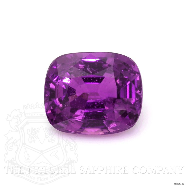 The ring features a beautiful, transparent C.Dunaigre certified 4.01 carat cushion shape purple sapphire with the dimensions of 9.46 x 7.95 x 5.59 mm and a mixed brilliant cut. It has a clarity grade of very slightly included (evaluated at eye level), vivid color saturation, and an excellent polish. The origin of this sapphire is Madagascar.