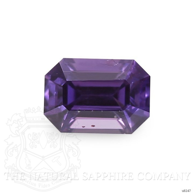 The ring features a beautiful, transparent 1.20 carat emerald cut shape purple sapphire with the dimensions of 6.96 x 4.91 x 3.74 mm and a emerald cut. It has a clarity grade of very slightly included (evaluated at eye level), vivid color saturation, and an excellent polish. The origin of this sapphire is Ceylon (Sri Lanka).