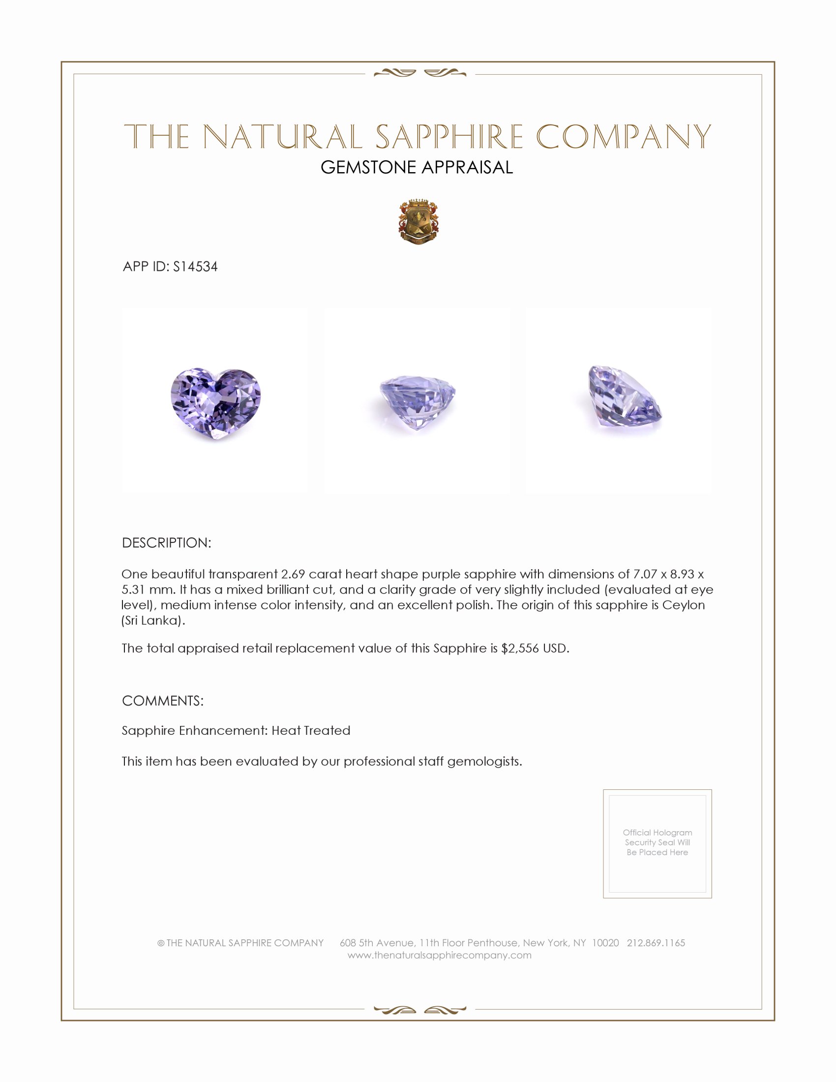 Introducing an exquisite masterpiece from The Natural Sapphire Company, this ring is a true testament to the art of fine jewelry craftsmanship. At its heart lies a captivating 2.69 carat purple sapphire, elegantly cut into a heart shape that boasts dimensions of 7.07 x 8.93 x 5.31 mm. The sapphire exhibits a mixed brilliant cut, allowing for maximum light dispersion and creating a symphony of brilliance with every movement. This gemstone is further enhanced by a clarity grade of very slightly included, evaluated at eye level, which ensures that its natural beauty shines through unobstructed. Its medium intense color saturation, heightened by a precise heat treatment process, endows the sapphire with a depth and vibrancy that echoes the storied landscapes of its origin, Ceylon.