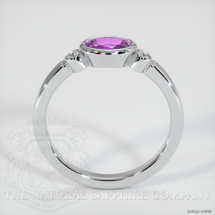 The ring features a beautiful, transparent 0.64 carat oval shape purple sapphire with the dimensions of 6.29 x 4.23 x 2.99 mm and a mixed brilliant cut. It has a clarity grade of very slightly included (evaluated at eye level), intense color saturation, and an excellent polish. The origin of this sapphire is Ceylon (Sri Lanka).