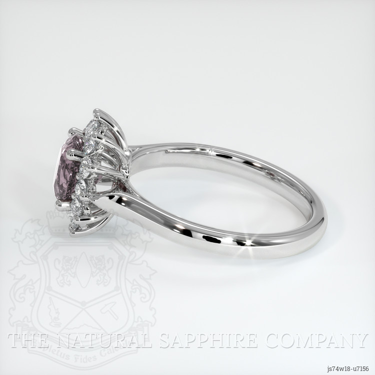 The ring features a beautiful, transparent 0.92 carat oval shape violet sapphire with the dimensions of 6.09 x 5.64 x 3.56 mm and a mixed brilliant cut. It has a clarity grade of very slightly included (evaluated at eye level), medium color saturation, and an excellent polish. The origin of this sapphire is Montana.