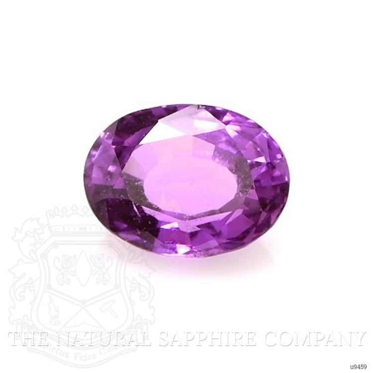The ring features a beautiful, transparent 1.04 carat oval shape purple sapphire with the dimensions of 6.94 x 5.17 x 3.25 mm and a mixed brilliant cut. It has a clarity grade of very slightly included (evaluated at eye level), intense color saturation, and an excellent polish. The origin of this sapphire is Ceylon (Sri Lanka).