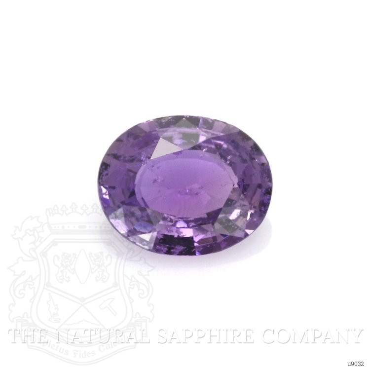 The ring features a beautiful, transparent 1.67 carat oval shape purple sapphire with the dimensions of 8.55 x 6.87 x 3.47 mm and a mixed brilliant cut. It has a clarity grade of very slightly included (evaluated at eye level), intense color saturation, and an excellent polish. The origin of this sapphire is Ceylon (Sri Lanka).