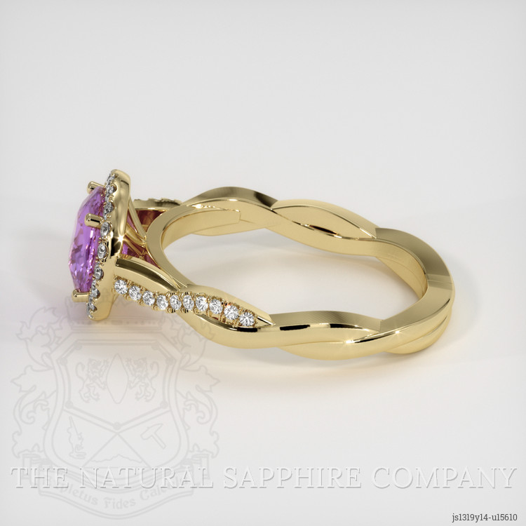The ring features a beautiful, transparent Other certified Purple 1.69 carat oval shape purple sapphire with the dimensions of 7.64 x 7.20 x 3.72 mm and a mixed brilliant cut. It has a clarity grade of very slightly included (evaluated at eye level), medium color saturation, and an excellent polish. The origin of this sapphire is Ceylon (Sri Lanka).