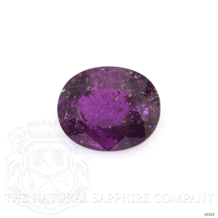The ring features a beautiful, transparent 1.84 carat oval shape purple sapphire with the dimensions of 8.18 x 6.68 x 3.81 mm and a mixed brilliant cut. It has a clarity grade of slightly included (evaluated at eye level), vivid color saturation, and an excellent polish. The origin of this sapphire is Ceylon (Sri Lanka).