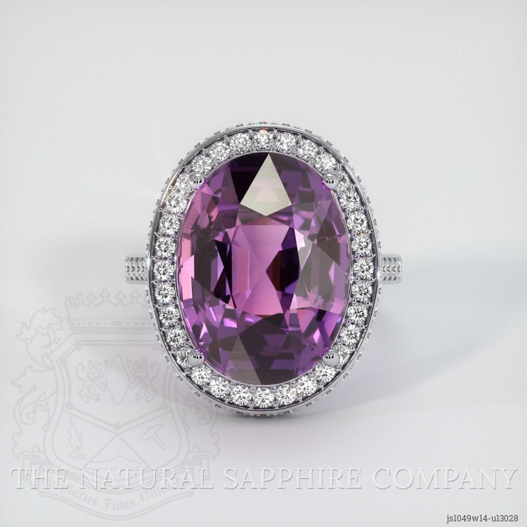 The ring features a beautiful, transparent GRS certified Purple 13.78 carat oval shape purple sapphire with the dimensions of 15.87 x 11.91 x 8.76 mm and a mixed brilliant cut. It has a clarity grade of eye clean (evaluated at eye level), intense color saturation, and an excellent polish. The origin of this sapphire is Madagascar.