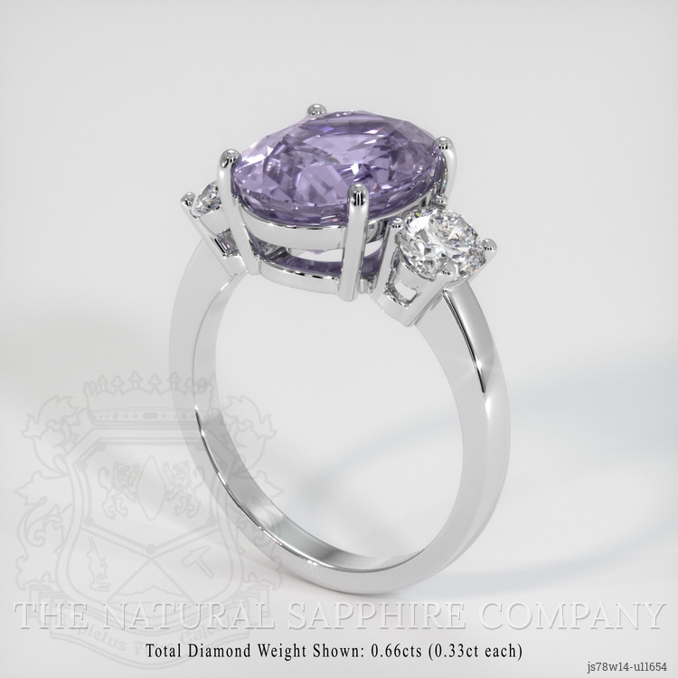 The ring features a beautiful, transparent 4.53 carat oval shape purple sapphire with the dimensions of 10.85 x 8.62 x 5.77 mm and a mixed brilliant cut. It has a clarity grade of very slightly included (evaluated at eye level), medium light color saturation, and an excellent polish. The origin of this sapphire is Ceylon (Sri Lanka).