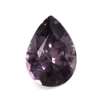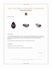 The ring features a beautiful, transparent 0.66 carat pear shape purple sapphire with the dimensions of 6.38 x 4.54 x 3.25 mm and a mixed brilliant cut. It has a clarity grade of very slightly included (evaluated at eye level), medium intense color saturation, and an excellent polish. The origin of this sapphire is Montana.