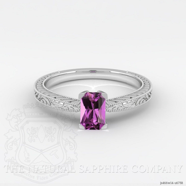 The ring features a beautiful, transparent 0.57 carat radiant shape purple sapphire with the dimensions of 6.06 x 3.99 x 2.65 mm and a radiant cut. It has a clarity grade of very slightly included (evaluated at eye level), medium intense color saturation, and an excellent polish. The origin of this sapphire is Ceylon (Sri Lanka).