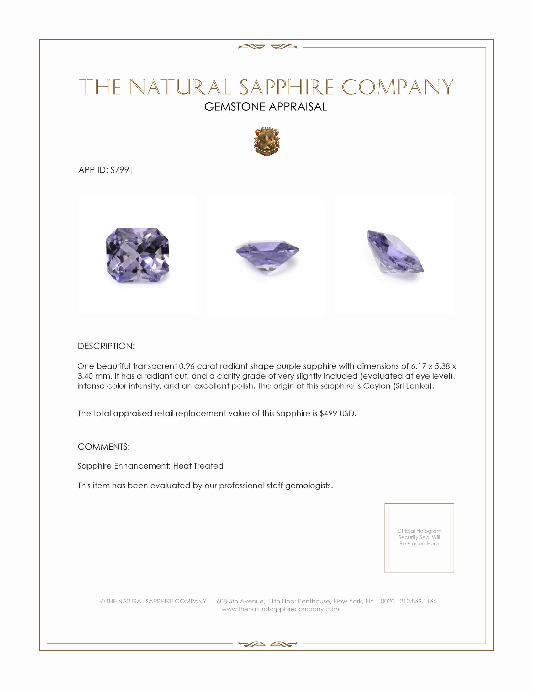 Introducing an exquisite creation from The Natural Sapphire Company, a piece where craftsmanship and nature converge in a celebration of elegance and symbolism. At the heart of this mesmerizing ring lies a 0.96-carat radiant shape purple sapphire with dimensions of 6.17 x 5.38 x 3.40 mm. The sapphire’s radiant cut enhances its brilliance, allowing the intense color saturation to shimmer with every movement. Sourced from Ceylon, Sri Lanka, this sapphire exemplifies the breathtaking beauty of its origin, known for producing some of the world's most exceptional gemstones. The stone undergoes careful heat treatment to maximize its natural beauty, resulting in a clarity grade of very slightly included, evaluated at eye level, exhibiting an excellent polish that highlights its perfection.
