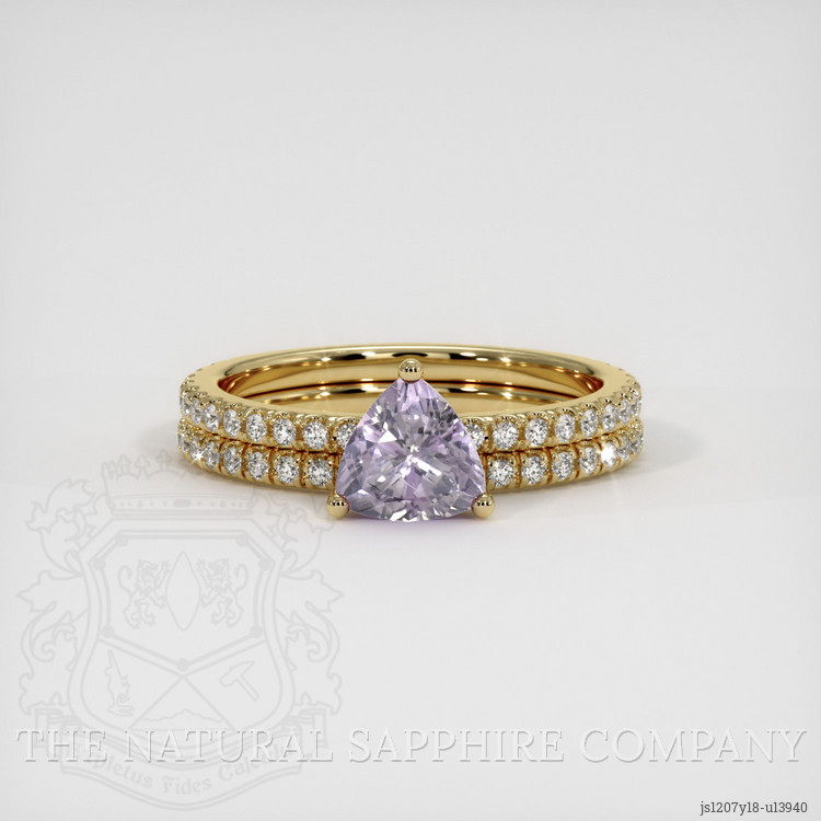 The ring features a beautiful, transparent 0.98 carat trillion shape purple sapphire with the dimensions of 6.07 x 6.11 x 4.03 mm and a trillion cut. It has a clarity grade of very slightly included (evaluated at eye level), medium intense color saturation, and an excellent polish. The origin of this sapphire is Montana.