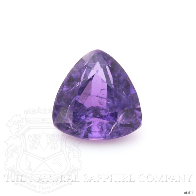 The ring features a beautiful, transparent 1.18 carat trillion shape purple sapphire with the dimensions of 6.37 x 6.24 x 3.71 mm and a mixed brilliant cut. It has a clarity grade of slightly included (evaluated at eye level), medium intense color saturation, and an excellent polish. The origin of this sapphire is Tanzania.
