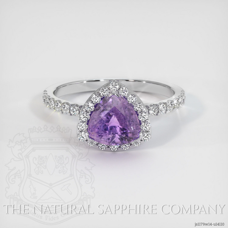 The ring features a beautiful, transparent 1.64 carat trillion shape purple sapphire with the dimensions of 7.18 x 7.29 x 4.13 mm and a mixed brilliant cut. It has a clarity grade of slightly included (evaluated at eye level), medium intense color saturation, and an excellent polish. The origin of this sapphire is Tanzania.
