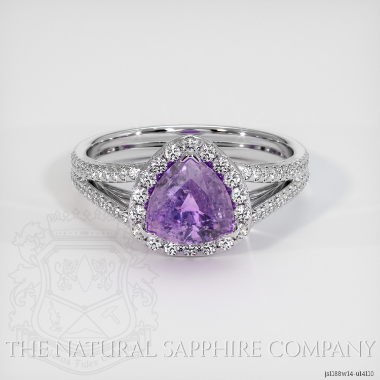 The ring features a beautiful, transparent 1.64 carat trillion shape purple sapphire with the dimensions of 7.18 x 7.29 x 4.13 mm and a mixed brilliant cut. It has a clarity grade of slightly included (evaluated at eye level), medium intense color saturation, and an excellent polish. The origin of this sapphire is Tanzania.