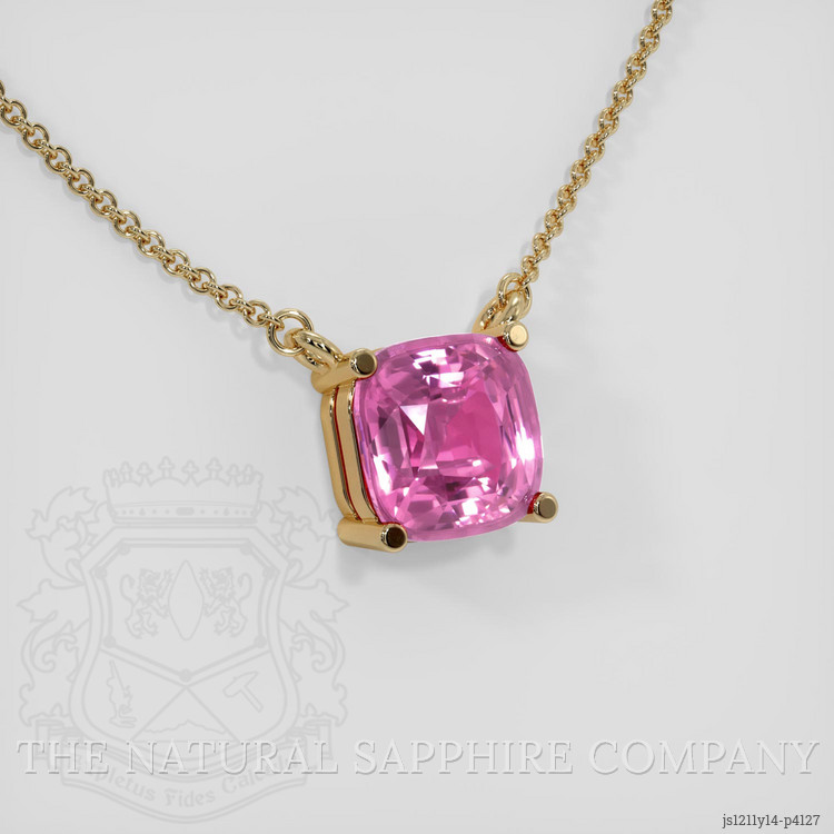 The necklace features a beautiful, transparent GIA certified Purplish Pink 3.00 carat cushion shape purplish pink sapphire with the dimensions of 8.06 x 7.97 x 5.01 mm and a mixed brilliant cut. It has a clarity grade of very slightly included (evaluated at eye level), intense color saturation, and an excellent polish. The origin of this sapphire is Ceylon (Sri Lanka).
