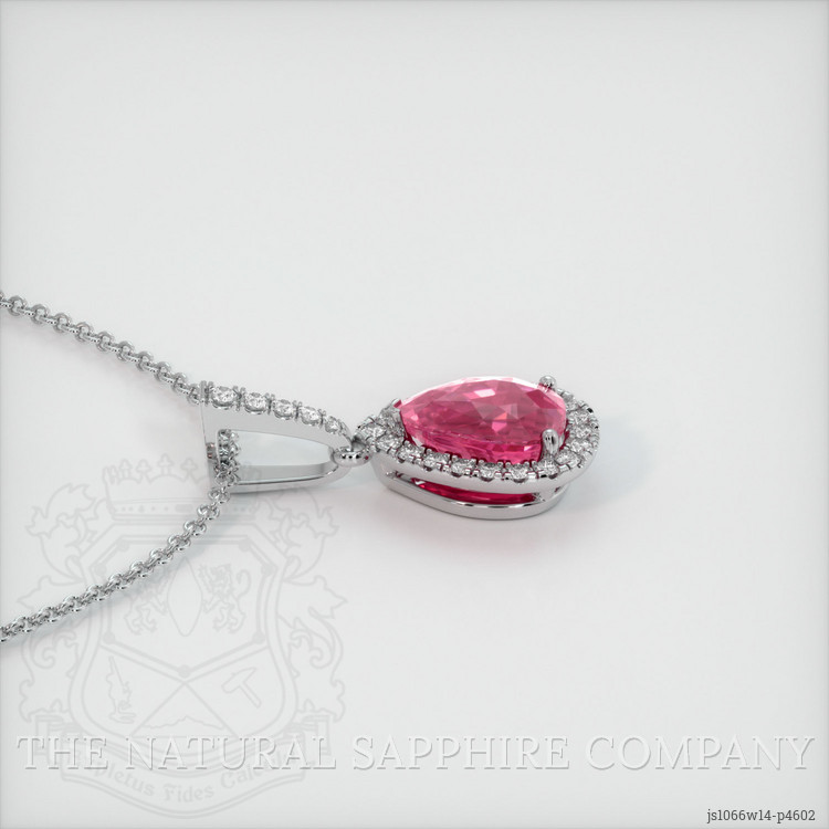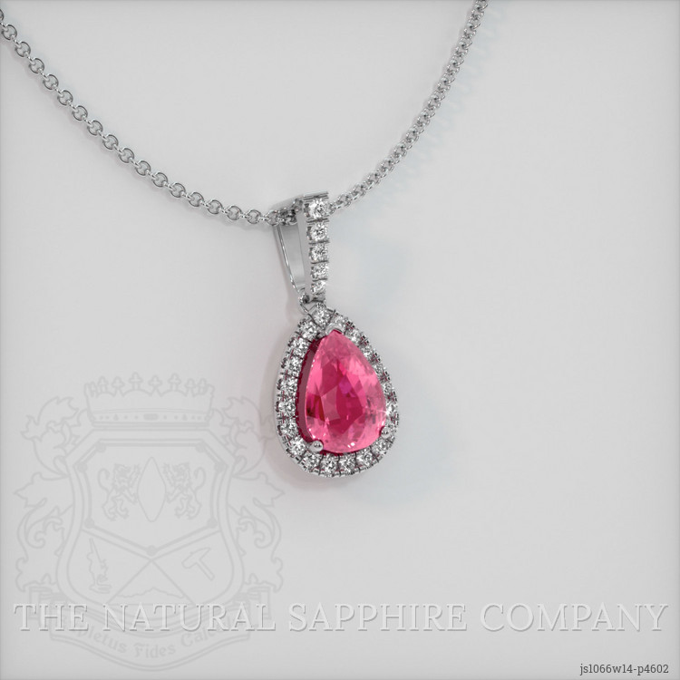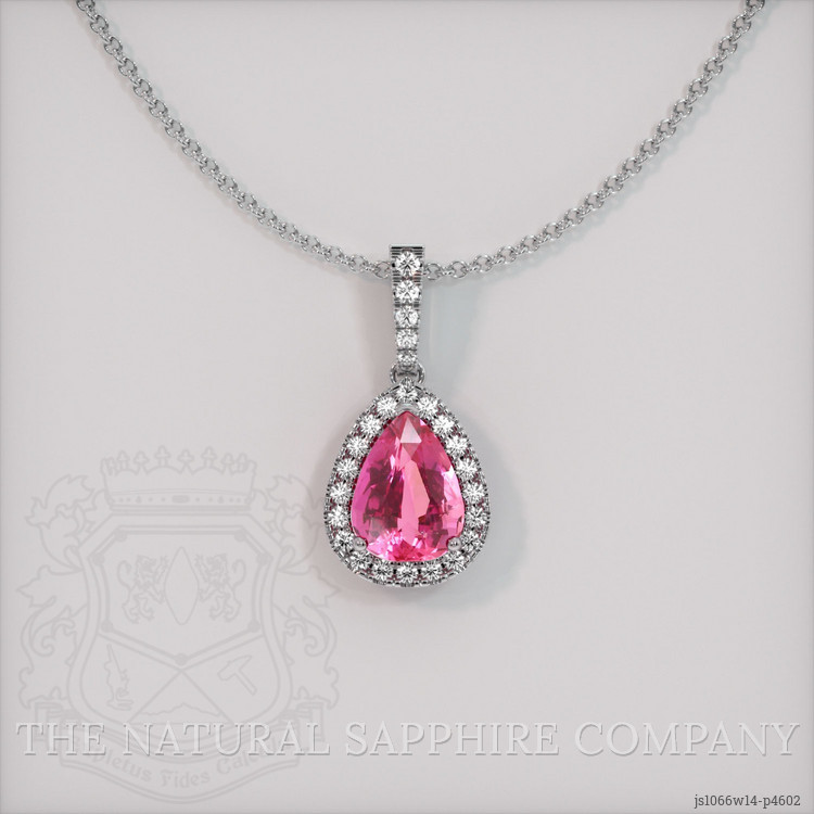 The pendant features a beautiful, transparent GIA certified Purplish Pink 2.96 carat pear shape purplish pink sapphire with the dimensions of 10.05 x 7.38 x 5.38 mm and a mixed brilliant cut. It has a clarity grade of very slightly included (evaluated at eye level), vivid color saturation, and an excellent polish. The origin of this sapphire is Ceylon (Sri Lanka).