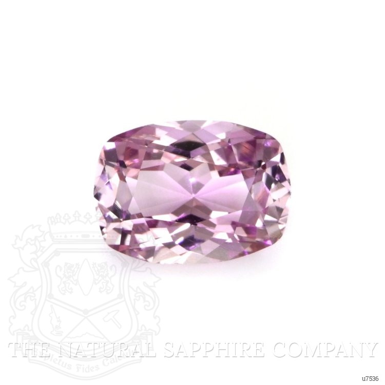 The ring features a beautiful, transparent 1.07 carat cushion shape purplish pink sapphire with the dimensions of 7.06 x 5.12 x 3.52 mm and a mixed brilliant cut. It has a clarity grade of very slightly included (evaluated at eye level), medium color saturation, and an excellent polish. The origin of this sapphire is Ceylon (Sri Lanka).