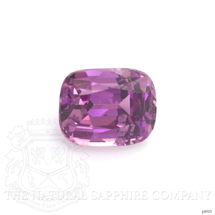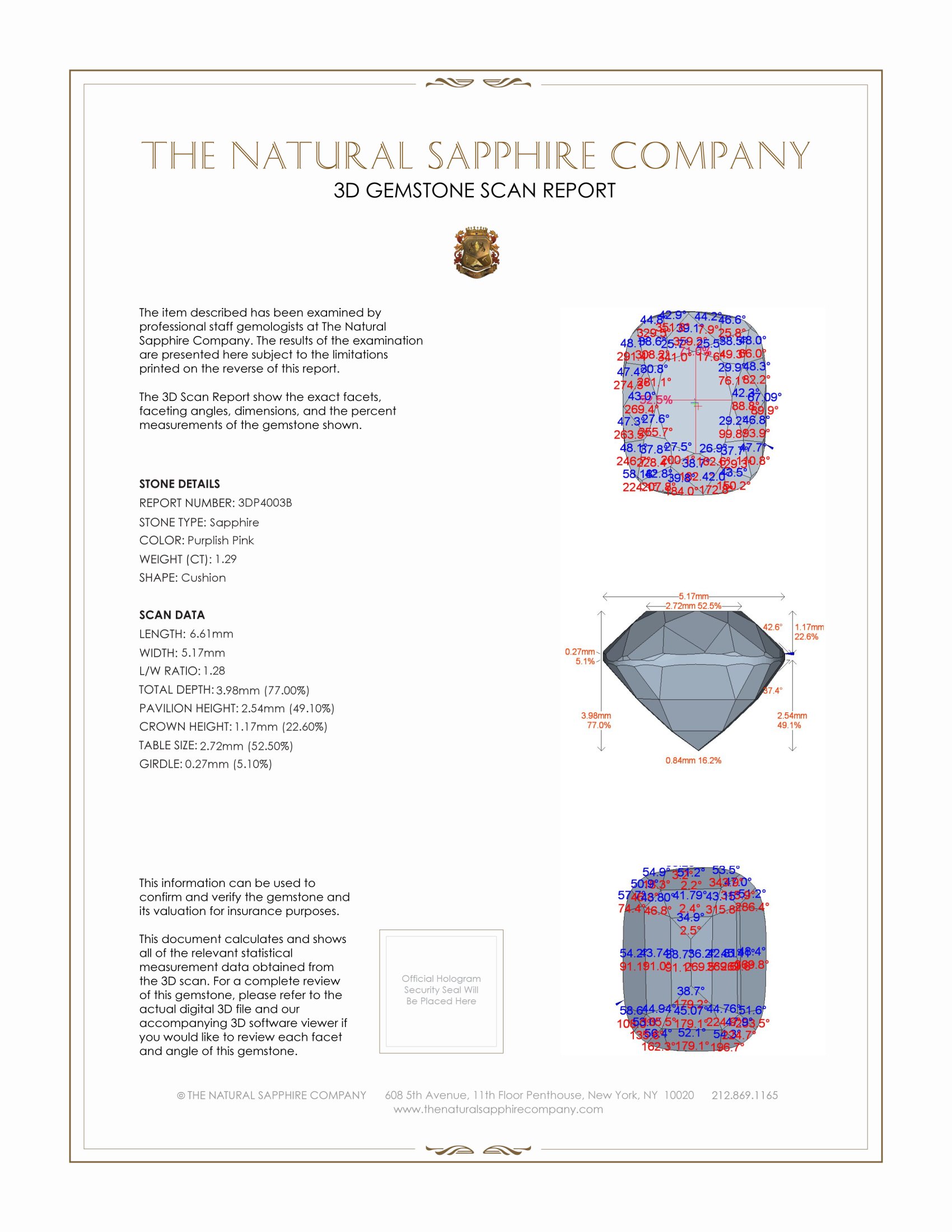 The ring features a beautiful, transparent 1.29 carat cushion shape purplish pink sapphire with the dimensions of 6.61 x 5.17 x 3.98 mm and a mixed brilliant cut. It has a clarity grade of slightly included (evaluated at eye level), vivid color saturation, and an excellent polish. The origin of this sapphire is Ceylon (Sri Lanka).