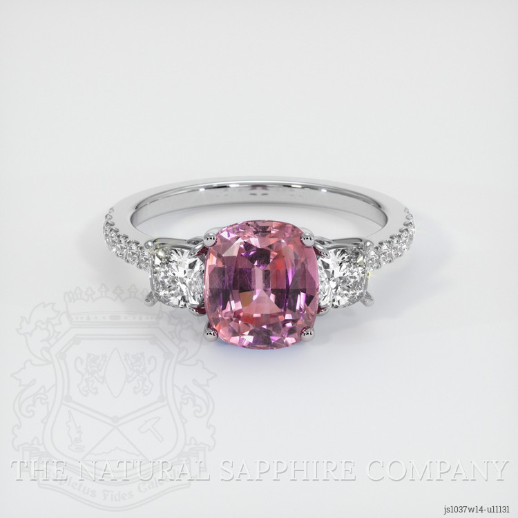 The ring features a beautiful, transparent 2.12 carat cushion shape purplish pink sapphire with the dimensions of 7.52 x 6.52 x 4.72 mm and a mixed brilliant cut. It has a clarity grade of very slightly included (evaluated at eye level), intense color saturation, and an excellent polish. The origin of this sapphire is Ceylon (Sri Lanka).