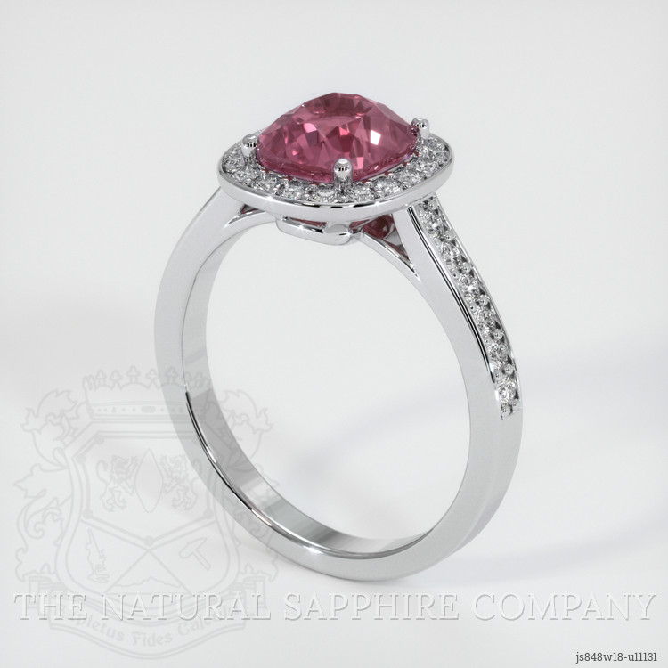 The ring features a beautiful, transparent 2.12 carat cushion shape purplish pink sapphire with the dimensions of 7.52 x 6.52 x 4.72 mm and a mixed brilliant cut. It has a clarity grade of very slightly included (evaluated at eye level), intense color saturation, and an excellent polish. The origin of this sapphire is Ceylon (Sri Lanka).