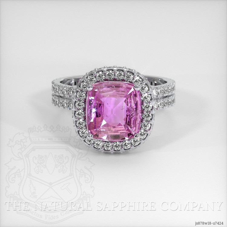 The ring features a beautiful, transparent GAL certified Purplish Pink 2.12 carat cushion shape purplish pink sapphire with the dimensions of 8.22 x 7.58 x 3.79 mm and a mixed brilliant cut. It has a clarity grade of very slightly included (evaluated at eye level), medium intense color saturation, and an excellent polish. The origin of this sapphire is Ceylon (Sri Lanka).