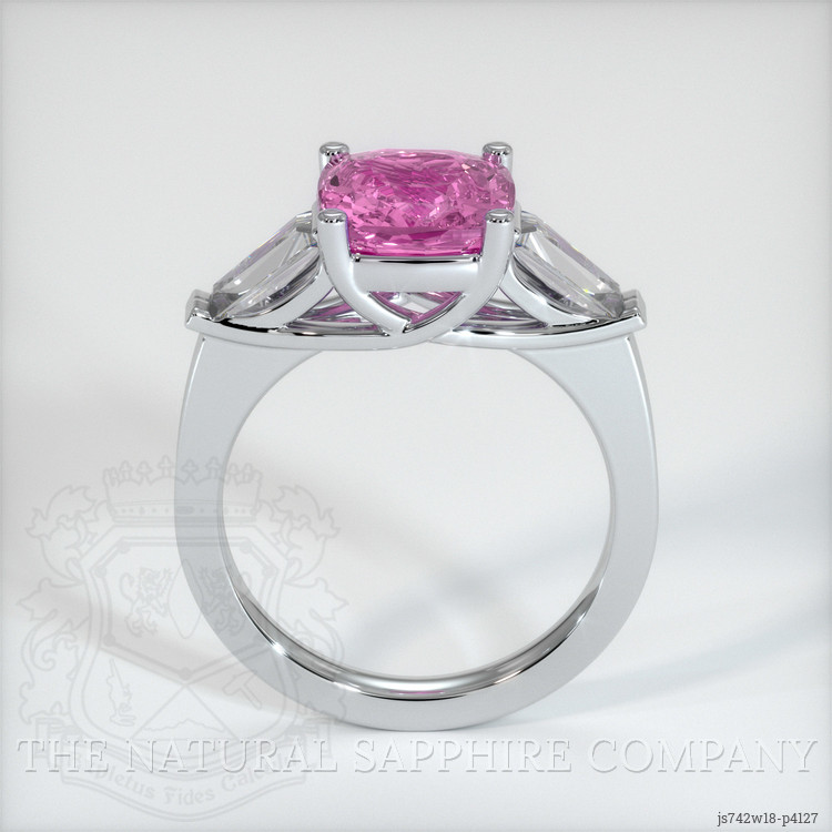 The ring features a beautiful, transparent GIA certified Purplish Pink 3.00 carat cushion shape purplish pink sapphire with the dimensions of 8.06 x 7.97 x 5.01 mm and a mixed brilliant cut. It has a clarity grade of very slightly included (evaluated at eye level), intense color saturation, and an excellent polish. The origin of this sapphire is Ceylon (Sri Lanka).