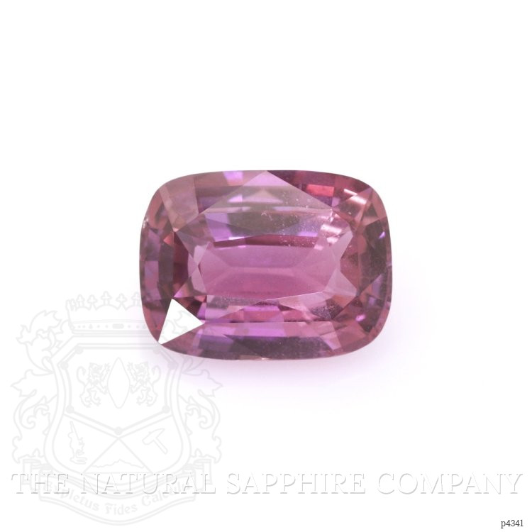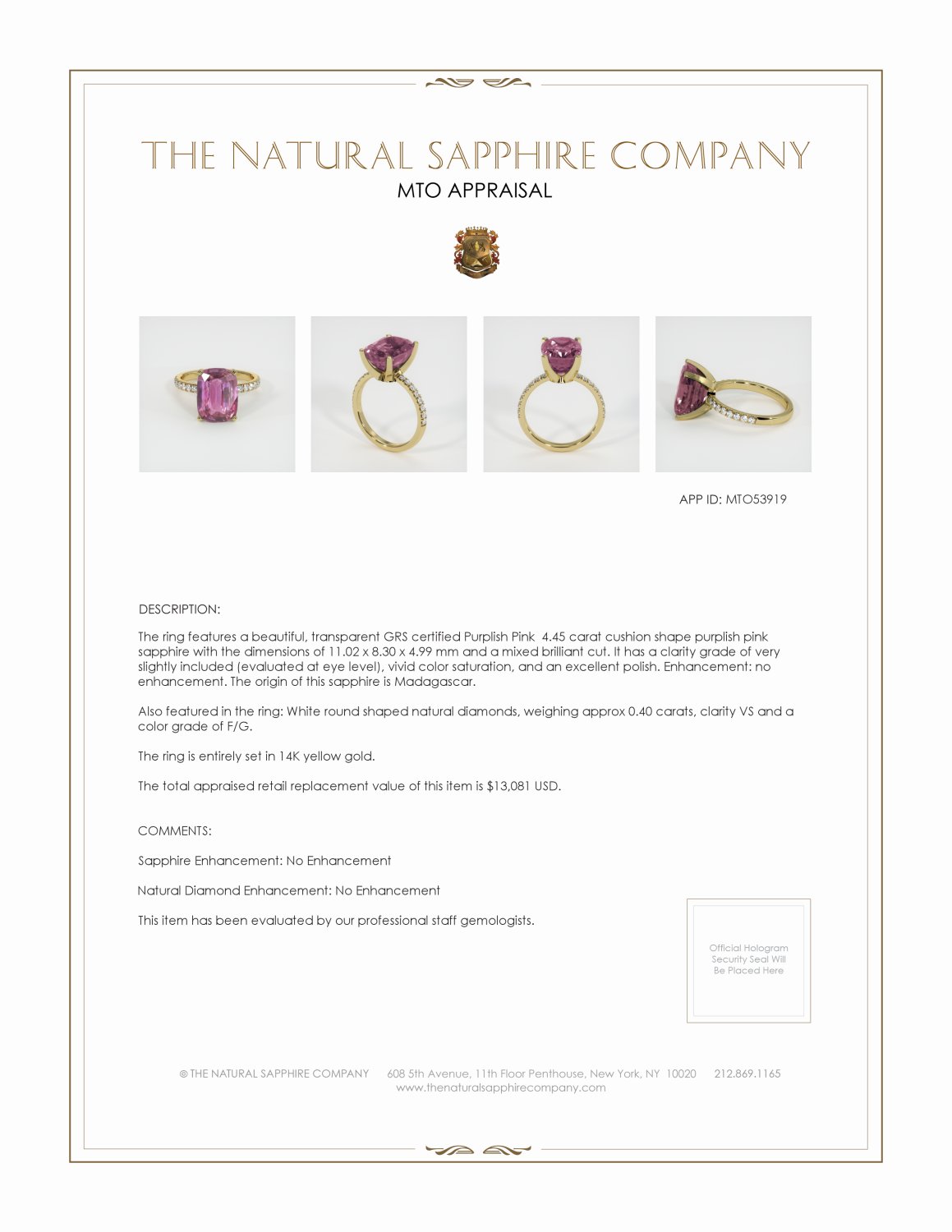 The ring features a beautiful, transparent GRS certified Purplish Pink 4.45 carat cushion shape purplish pink sapphire with the dimensions of 11.02 x 8.30 x 4.99 mm and a mixed brilliant cut. It has a clarity grade of very slightly included (evaluated at eye level), vivid color saturation, and an excellent polish. The origin of this sapphire is Madagascar.