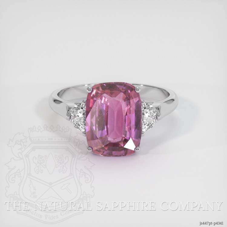 The ring features a beautiful, transparent GRS certified Purplish Pink 4.45 carat cushion shape purplish pink sapphire with the dimensions of 11.02 x 8.30 x 4.99 mm and a mixed brilliant cut. It has a clarity grade of very slightly included (evaluated at eye level), vivid color saturation, and an excellent polish. The origin of this sapphire is Madagascar.