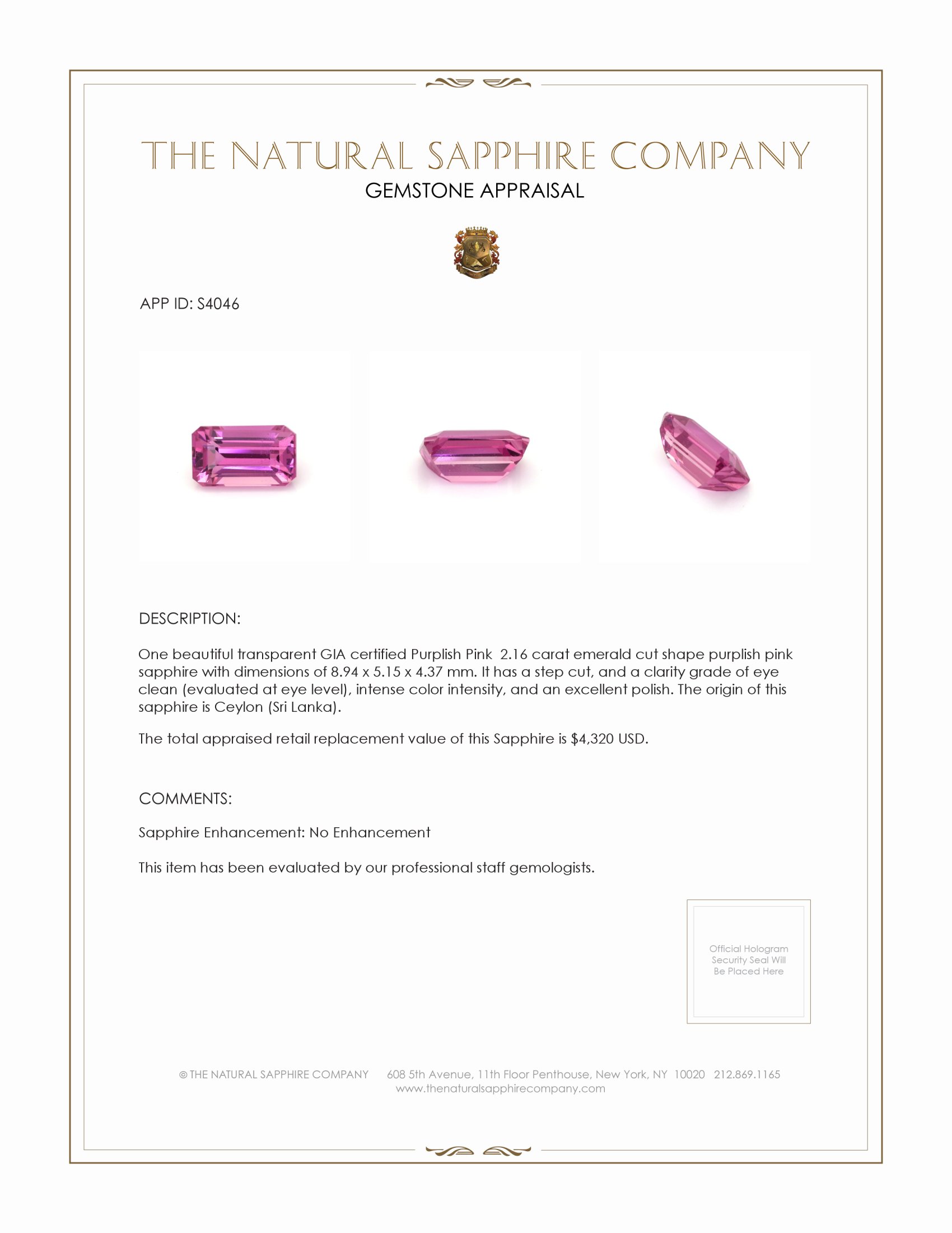 The Natural Sapphire Company proudly presents an exquisite ring that epitomizes elegance and sophisticated craftsmanship. At its heart lies a remarkable Purplish Pink sapphire, certified by the Gemological Institute of America (GIA) and hailing from the storied mines of Ceylon, Sri Lanka. This 2.16 carat sapphire boasts an emerald cut, with precise dimensions of 8.94 x 5.15 x 4.37 mm. Its step cut maximizes the stone's brilliance and transparency, ensuring that every facet of its eye-clean clarity captures and reflects light with exceptional intensity. The gemstone's natural, vibrant saturation is untouched by enhancement, offering a testament to its pure origin and rarity.