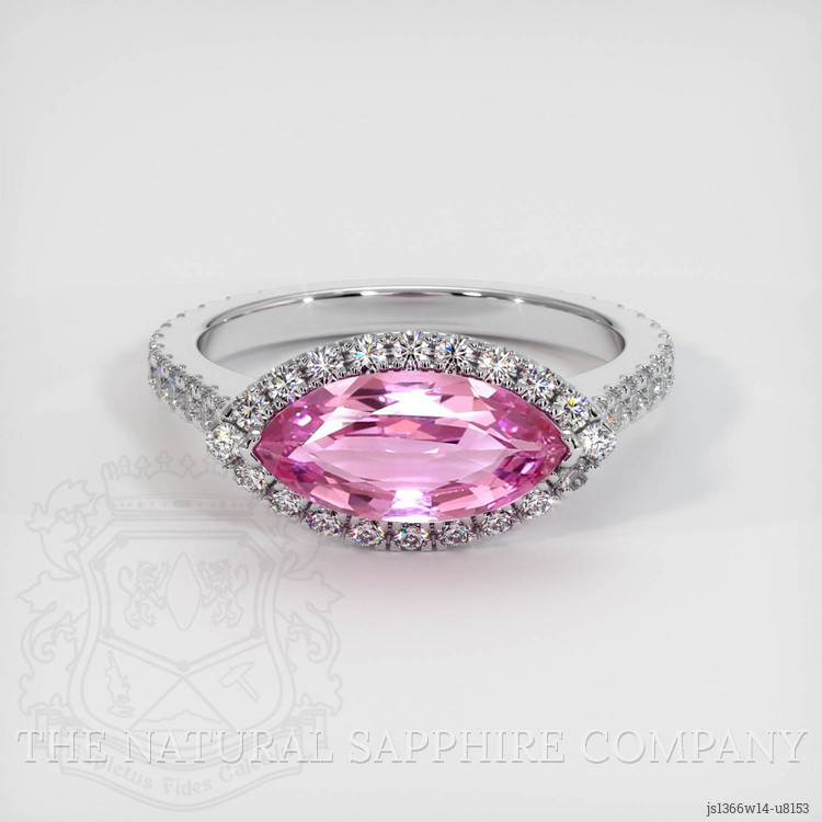 The ring features a beautiful, transparent 1.95 carat marquise shape purplish pink sapphire with the dimensions of 11.76 x 5.63 x 3.42 mm and a mixed brilliant cut. It has a clarity grade of very slightly included (evaluated at eye level), intense color saturation, and an excellent polish. The origin of this sapphire is Ceylon (Sri Lanka).