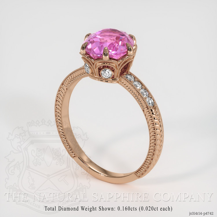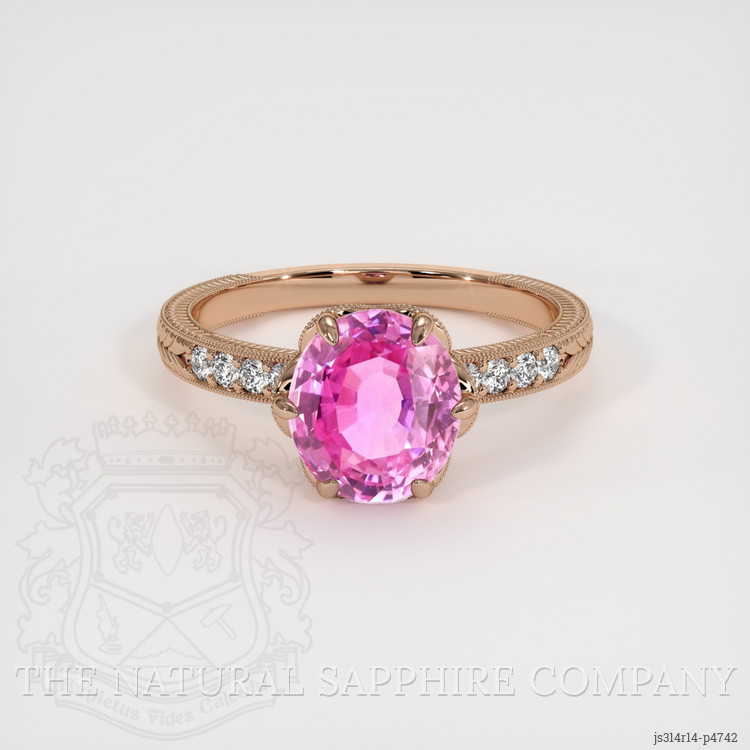 The exquisite ring from The Natural Sapphire Company embodies romantic symbolism through its thoughtful design and selection of precious materials. At the heart of this ring lies a GIA certified Purple-Pink sapphire, showcasing a stunning 2.12 carat oval shape with dimensions of 7.80 x 6.96 x 4.65 mm. This gem, sourced from Madagascar, features an intense purplish-pink hue with a mixed brilliant cut. Its clarity, rated as very slightly included, enhances the stone’s natural allure and sparkle under any light. The excellent polish further accentuates the gemstone's vibrant color and intricate design, making it an emblem of enduring love and devotion.