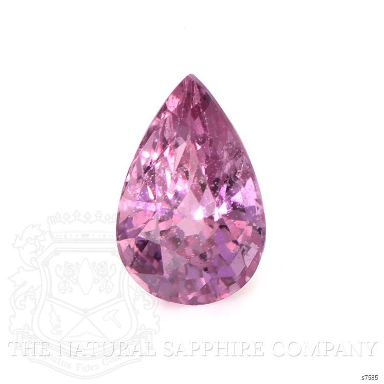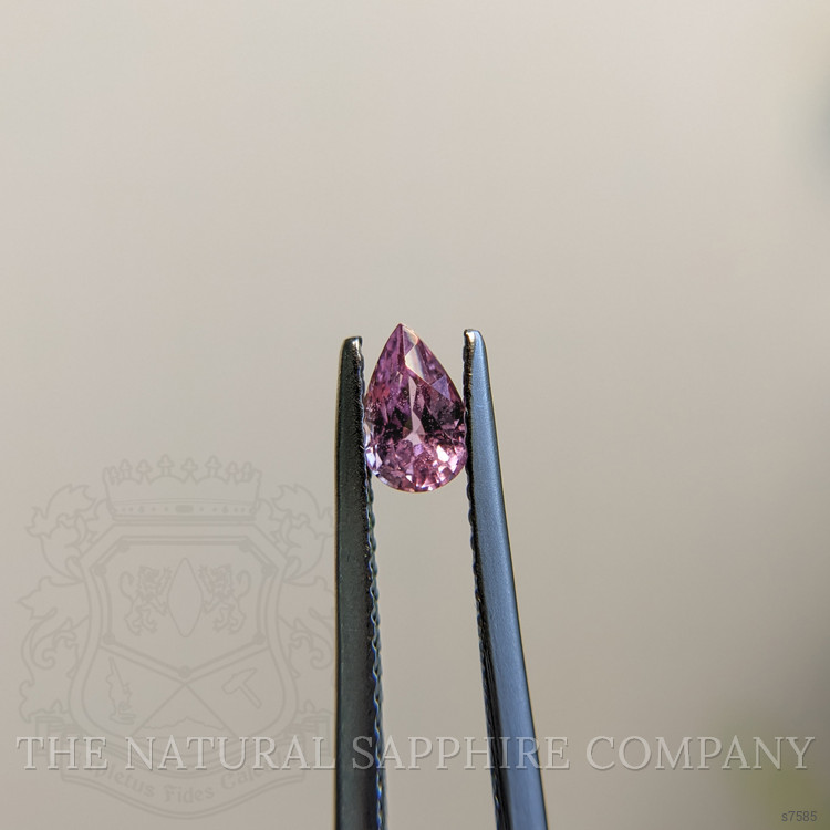 The ring features a beautiful, transparent 0.50 carat pear shape purplish pink sapphire with the dimensions of 5.91 x 3.83 x 3.02 mm and a mixed brilliant cut. It has a clarity grade of slightly included (evaluated at eye level), intense color saturation, and an excellent polish. The origin of this sapphire is Madagascar.