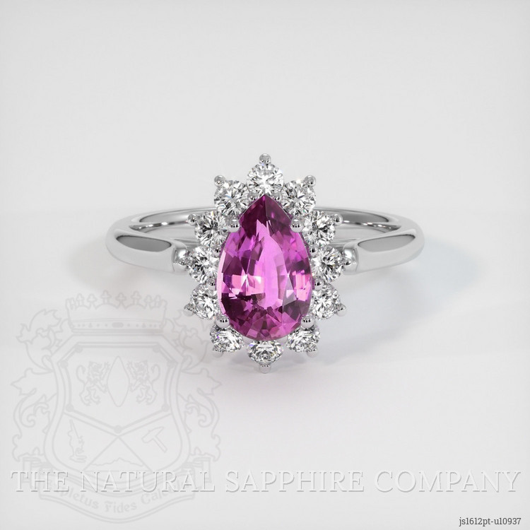 The ring features a beautiful, transparent 1.70 carat pear shape purplish pink sapphire with the dimensions of 9.47 x 6.14 x 3.80 mm and a mixed brilliant cut. It has a clarity grade of very slightly included (evaluated at eye level), intense color saturation, and an excellent polish. The origin of this sapphire is Ceylon (Sri Lanka).