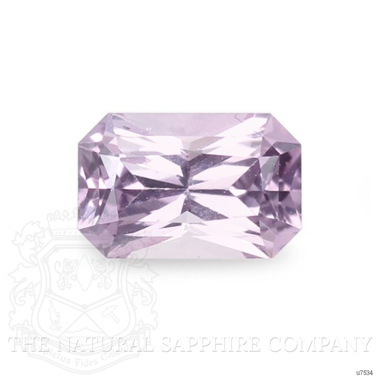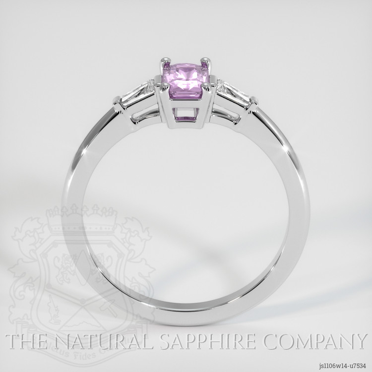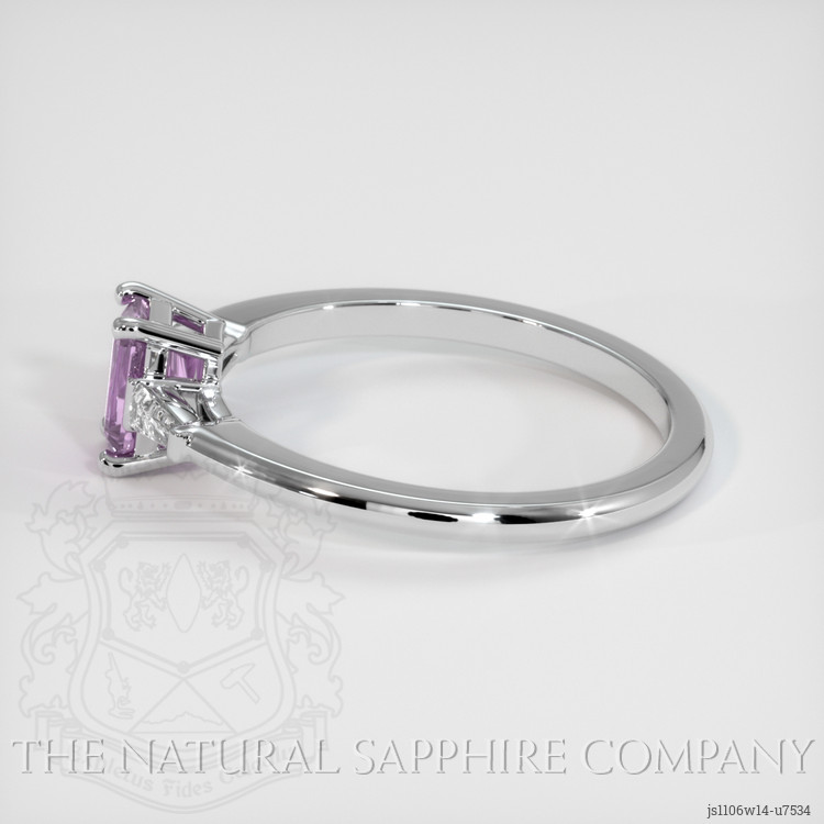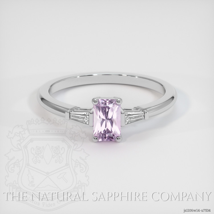 The ring features a beautiful, transparent 0.69 carat radiant shape purplish pink sapphire with the dimensions of 6.10 x 3.97 x 3.10 mm and a radiant cut. It has a clarity grade of very slightly included (evaluated at eye level), medium intense color saturation, and an excellent polish. The origin of this sapphire is Ceylon (Sri Lanka).