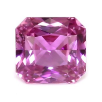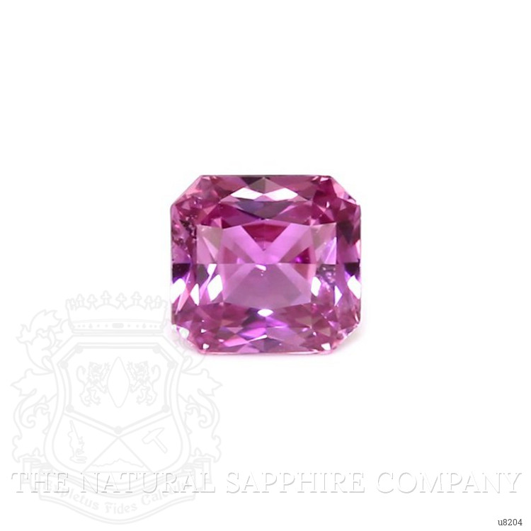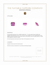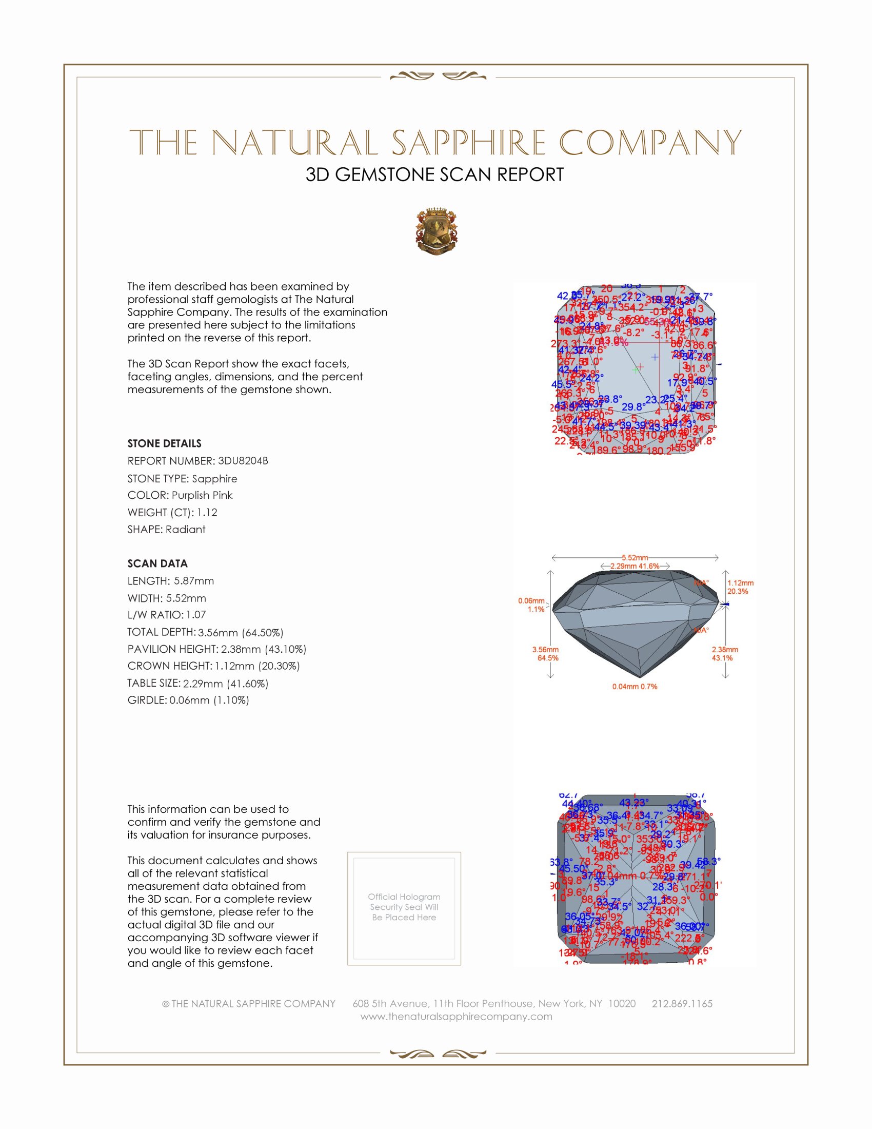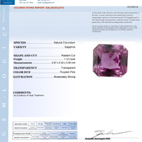The ring features a beautiful, transparent GAL certified Purplish Pink 1.12 carat radiant shape purplish pink sapphire with the dimensions of 5.87 x 5.52 x 3.56 mm and a radiant cut. It has a clarity grade of very slightly included (evaluated at eye level), intense color saturation, and an excellent polish. The origin of this sapphire is Ceylon (Sri Lanka).