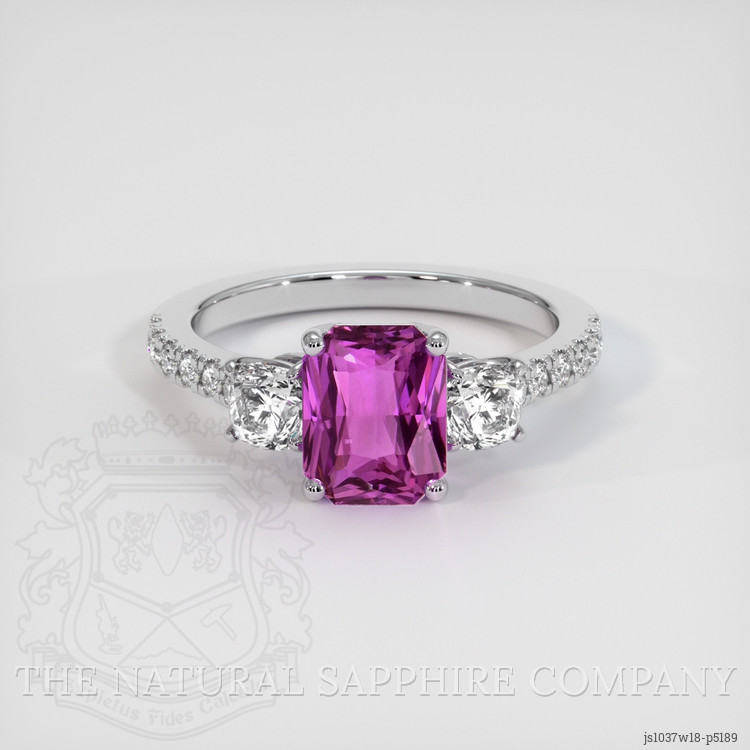 The ring features a beautiful, transparent 2.04 carat radiant shape pink sapphire with the dimensions of 8.12 x 6.51 x 4.07 mm and a radiant cut. It has a clarity grade of very slightly included (evaluated at eye level), intense color saturation, and an excellent polish. The origin of this sapphire is Ceylon (Sri Lanka).