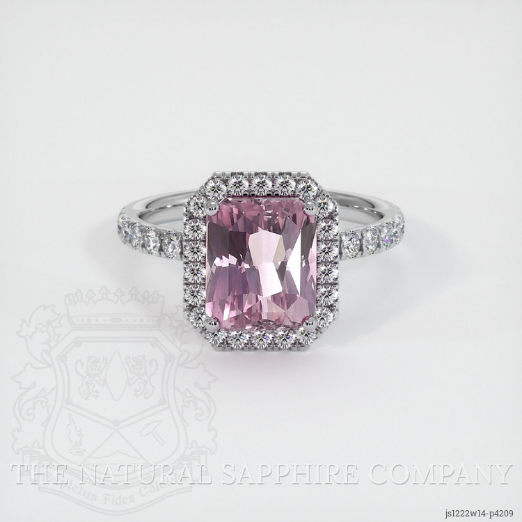 The ring features a beautiful, transparent 3.06 carat radiant shape pink sapphire with the dimensions of 8.62 x 7.21 x 5.14 mm and a radiant cut. It has a clarity grade of eye clean (evaluated at eye level), medium color saturation, and an excellent polish. The origin of this sapphire is Ceylon (Sri Lanka).