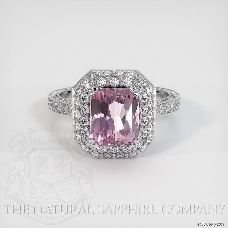 The ring features a beautiful, transparent 3.06 carat radiant shape pink sapphire with the dimensions of 8.62 x 7.21 x 5.14 mm and a radiant cut. It has a clarity grade of eye clean (evaluated at eye level), medium color saturation, and an excellent polish. The origin of this sapphire is Ceylon (Sri Lanka).