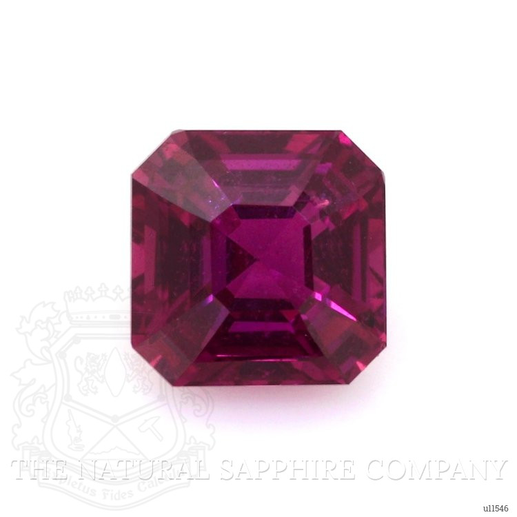 The ring features a beautiful, transparent 1.53 carat asscher shape reddish pink sapphire with the dimensions of 6.12 x 6.08 x 4.22 mm and a asscher cut. It has a clarity grade of very slightly included (evaluated at eye level), vivid color saturation, and an excellent polish. The origin of this sapphire is Ceylon (Sri Lanka).