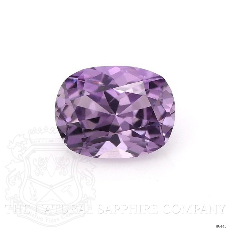 The ring features a beautiful, transparent 0.68 carat cushion shape violet sapphire with the dimensions of 6.20 x 4.77 x 3.26 mm and a mixed brilliant cut. It has a clarity grade of very slightly included (evaluated at eye level), medium intense color saturation, and an excellent polish. The origin of this sapphire is Ceylon (Sri Lanka).