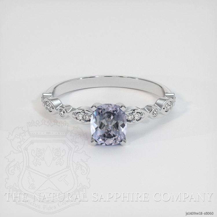 The ring features a beautiful, transparent 1.20 carat cushion shape violet sapphire with the dimensions of 6.29 x 5.35 x 4.14 mm and a mixed brilliant cut. It has a clarity grade of very slightly included, evaluated at eye level, medium light color saturation, and an excellent polish. The origin of this sapphire is Montana.