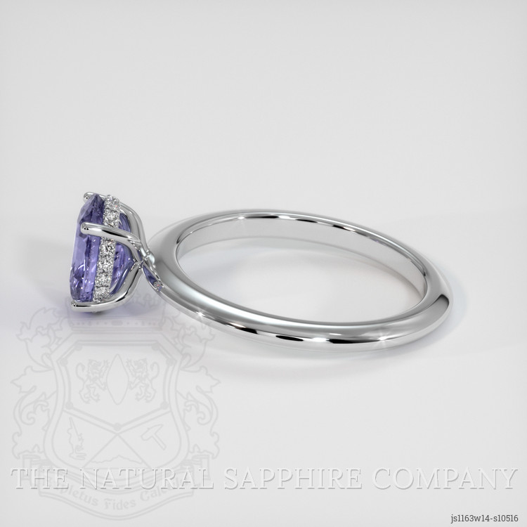 The ring features a beautiful, transparent 1.70 carat oval shape violet sapphire with the dimensions of 8.37 x 6.58 x 3.84 mm and a mixed brilliant cut. It has a clarity grade of very slightly included (evaluated at eye level), medium color saturation, and an excellent polish. The origin of this sapphire is Ceylon (Sri Lanka).