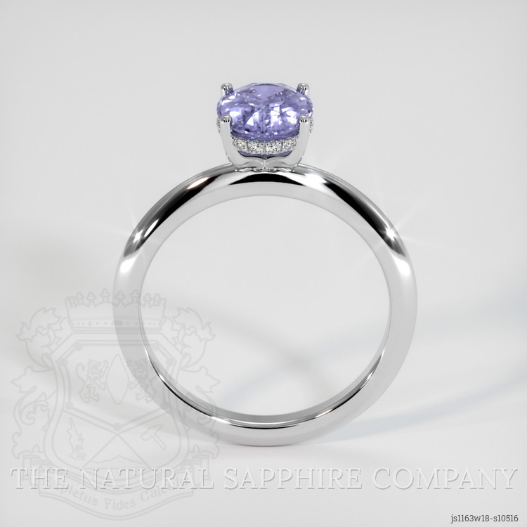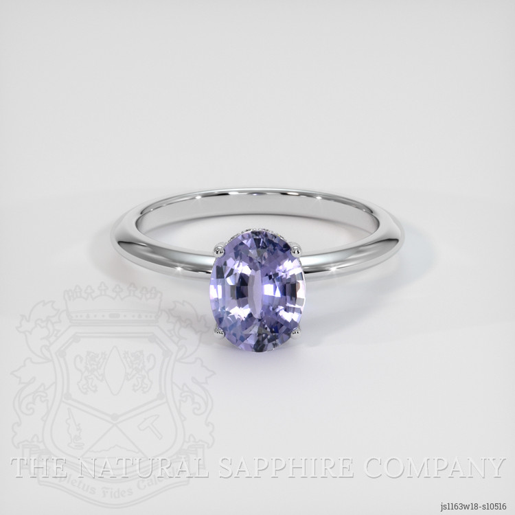 The ring features a beautiful, transparent 1.70 carat oval shape violet sapphire with the dimensions of 8.37 x 6.58 x 3.84 mm and a mixed brilliant cut. It has a clarity grade of very slightly included (evaluated at eye level), medium color saturation, and an excellent polish. The origin of this sapphire is Ceylon (Sri Lanka).