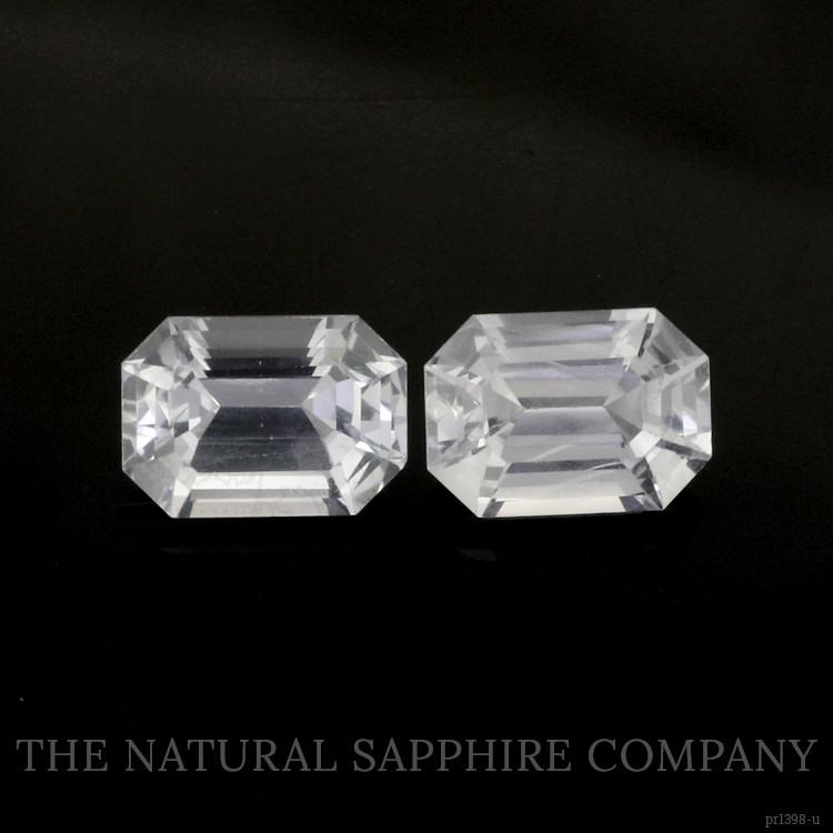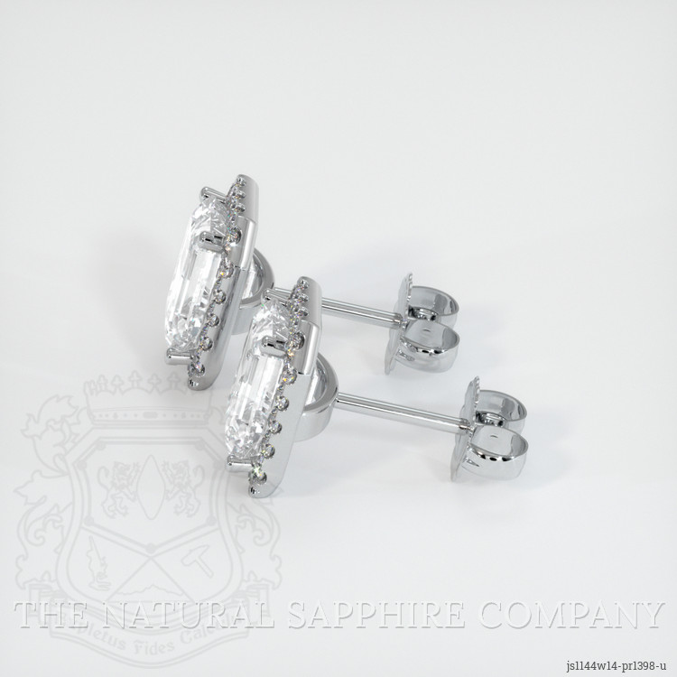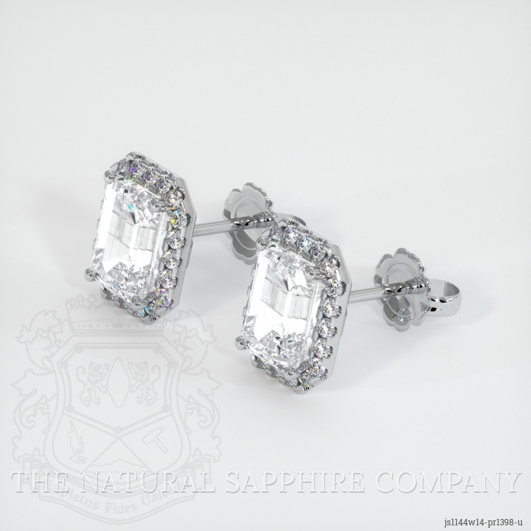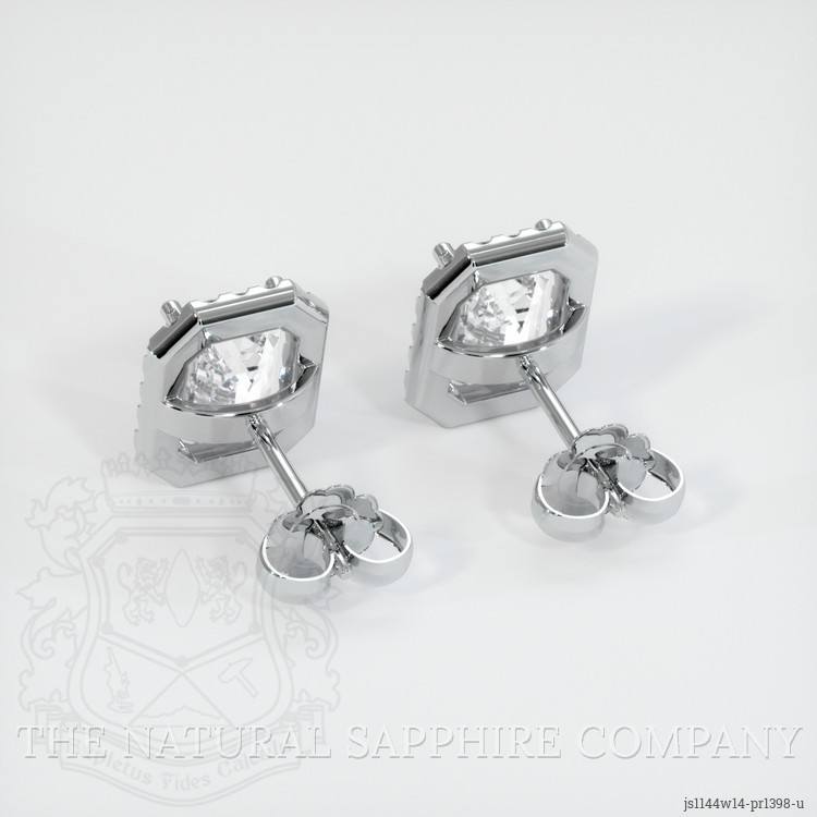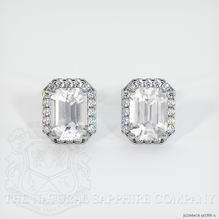 The earrings feature a beautiful, transparent pair of sapphires that are 2.43 total carat weight. They are emerald cut shape white sapphires, with the dimensions of 7.08 x 5.02 x 3.68 mm and are emerald cut, have a clarity grade of very slightly included (evaluated at eye level), near colorless color saturation, and an excellent polish. The origin of this pair of sapphires is Ceylon (Sri Lanka).