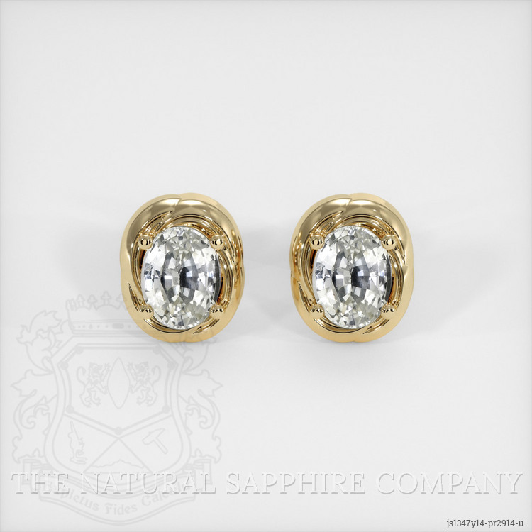 The earrings feature a beautiful, transparent pair of sapphires that are 2.48 total carat weight. They are oval shape white sapphires, with the dimensions of 7.18 x 5.53 x 3.81 mm and are mixed brilliant cut, have a clarity grade of very slightly included (evaluated at eye level), near colorless color saturation, and an excellent polish. The origin of this pair of sapphires is Ceylon (Sri Lanka).