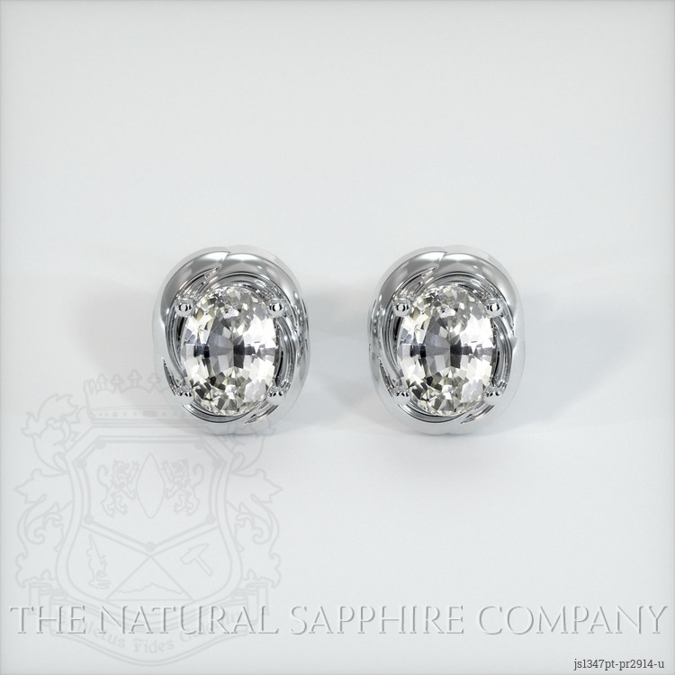 The earrings feature a beautiful, transparent pair of sapphires that are 2.48 total carat weight. They are oval shape white sapphires, with the dimensions of 7.18 x 5.53 x 3.81 mm and are mixed brilliant cut, have a clarity grade of very slightly included (evaluated at eye level), near colorless color saturation, and an excellent polish. The origin of this pair of sapphires is Ceylon (Sri Lanka).