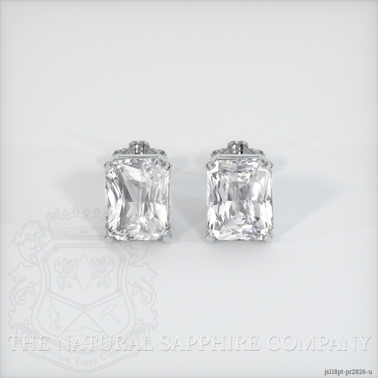 The earrings feature a beautiful, transparent pair of sapphires that are 8.24 total carat weight. They are radiant shape white sapphires, with the dimensions of 9.30 x 7.47 x 6.14 mm and are radiant cut, have a clarity grade of eye clean (evaluated at eye level), colorless color saturation, and an excellent polish. The origin of this pair of sapphires is Ceylon (Sri Lanka).